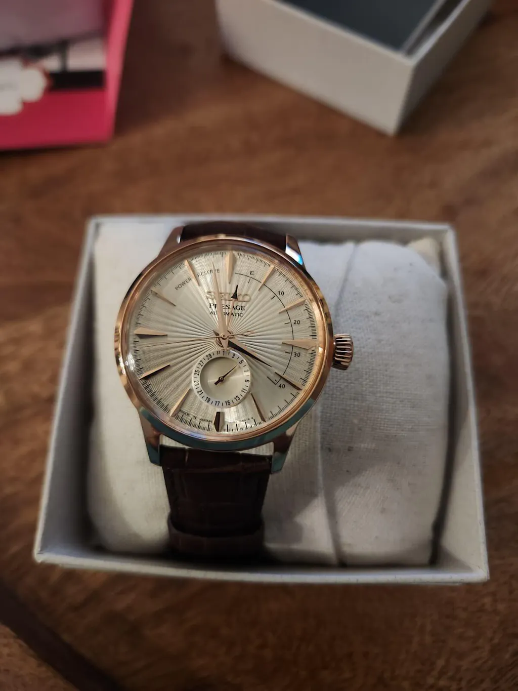My wife ordered this for my birthday, and it is absolutely beautiful! I wanted a brown-strap dress watch to wear with suits and formal attire, and was looking at Tissot, Longines, Bulova and Citizen for some options. While I found a few from other brands that were nice, I wasn't in love with any of them. I then saw the Seiko Presage SARY 132 and fell in love just from the photos. Unfortunately they are not available in Canada and were discontinued to allow for newer models to supersede. This model is available in Japan only - My wife purchased from here and I received the watch a few days ago! I must say, this is probably the nicest dress watch I have ever owned. Featuring an ivory dial with a sunburst pattern which catches the light differently in different angles, a well-crafted clasp that holds the perfect brown strap, a beautiful onion wind-crown, micro-detailed markings and speared hands/indicators, finished with the perfect champagne/rose-gold accents, this is a watch that looks like old-money and class. I am extremely satisfied with the purchase and the customer-service and delivery time was quick and easy. Prepare for customs-fees, but well worth the price and product!!! Thank you!